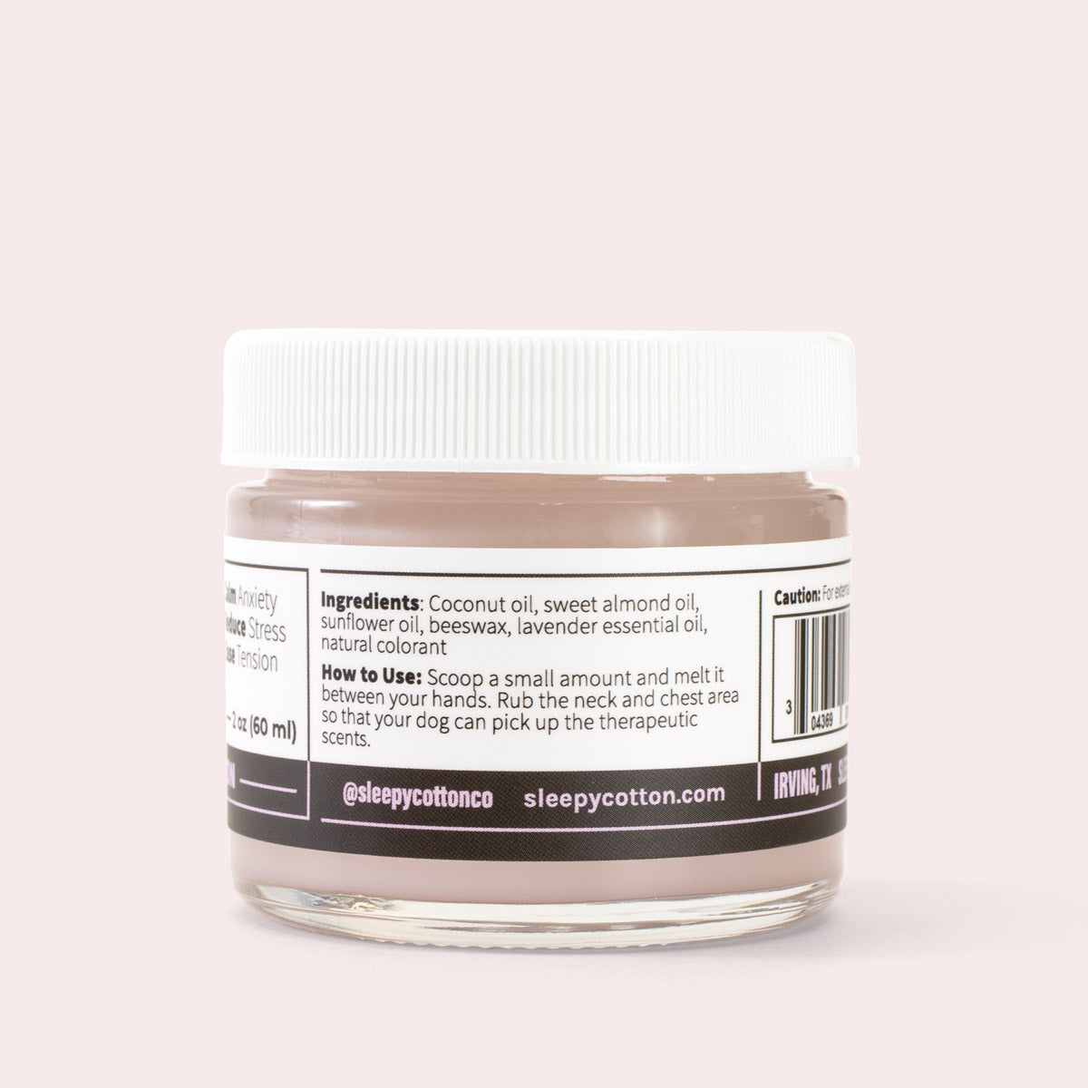 Are you looking for a natural way to calm your pup? As a dog parent, an overly energized fur baby can be exhausting. Our Lavender Balm is formulated to relax your furry friend the natural way. Therapeutic scents of the lavender flower reduce anxiety and stress without the use of harsh chemicals.